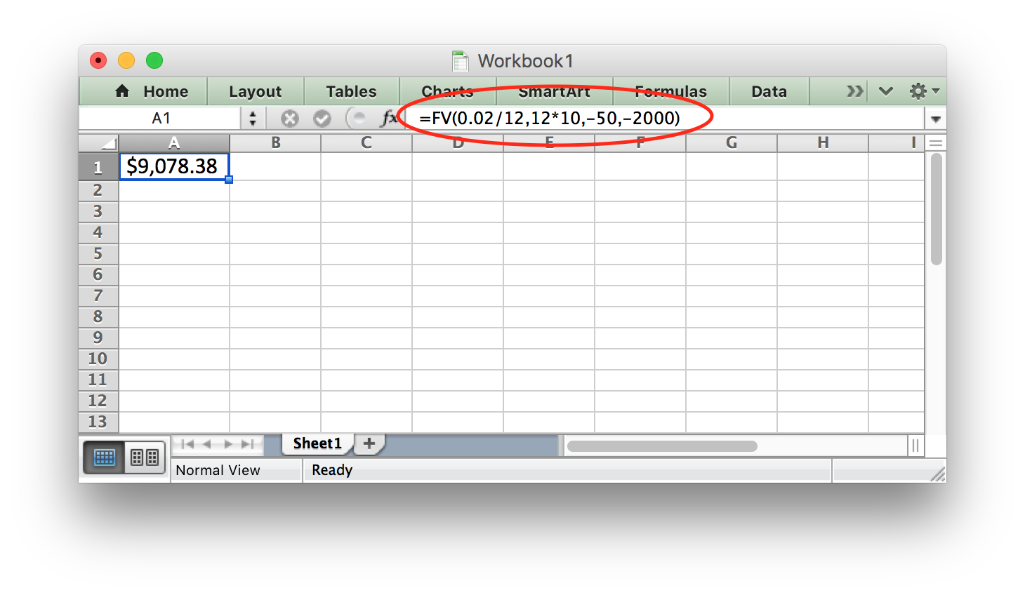 \[ \text{=FV(0.02/12,10*12,-50,-2000)} \]