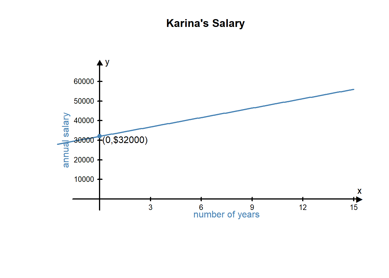 Our chart shows that the function \(y=1600x+32000\) accurately represents Karina’s situation. In this chart we see that for each additional year Karina worked for the company, her salary increased by $1600 per year.