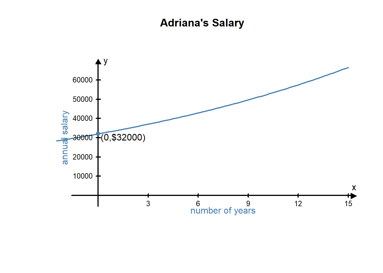 Now let’s look at a similar example where the slope is not constant. Adriana is also working at her first job after graduation. Like Karina, when she started her job she made $32,000 per year. However, instead of getting a $1600 raise each year, she gets a 5% raise each year. The function that will describe Adriana’s salary each year is: