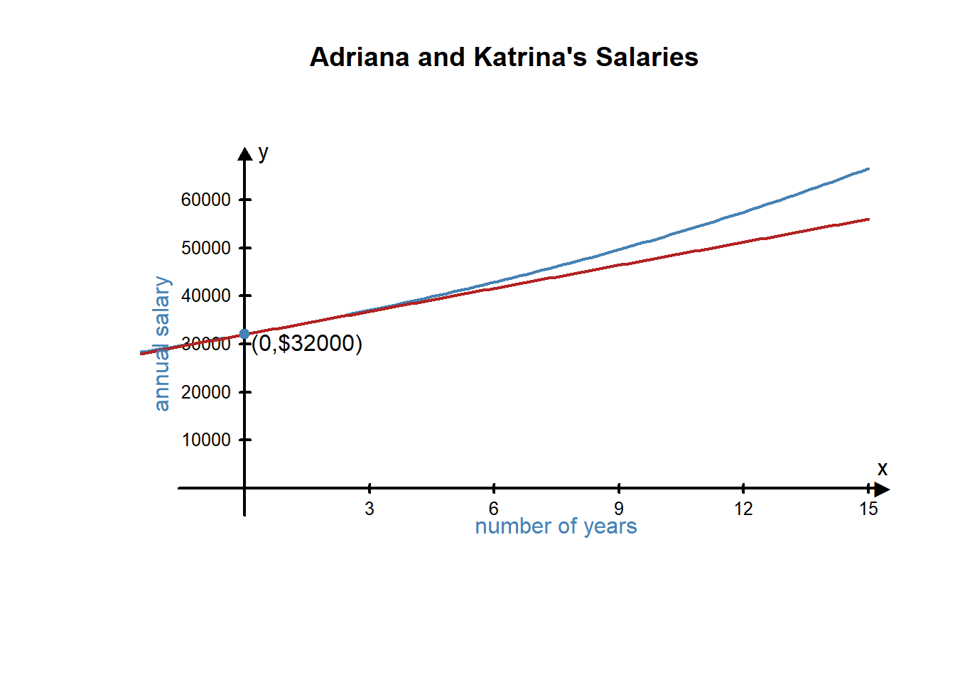 If we graph both Karina and Adriana’s salary functions on the same graph, it makes it easier to compare them and see that the graph of Adriana’s salary function is not a line. Notice that at first, their salaries are similar, but after a few years Adriana’s salary starts to pull away from Katrina’s salary. Notice Katrina’s salary continues to grow at a constant rate, but Adriana’s salary grows by increasingly larger amounts each year. This is the difference between linear and non-linear rates of change.