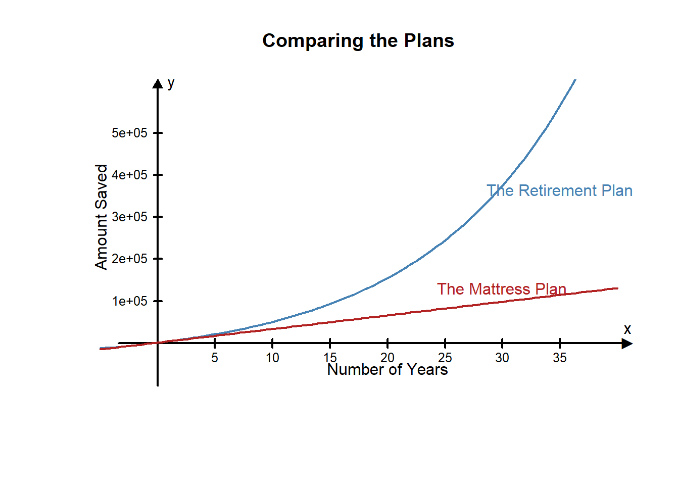 The following graph shows the graphs of the two savings plans over time: