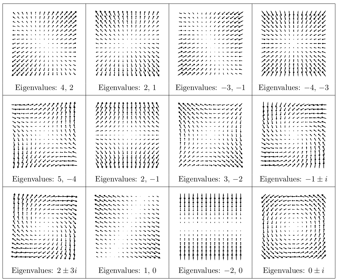 - Below are several vector field plots. Associated with each vector field plot are two numbers, called eigenvalues (which we will soon learn to compute). What patterns do you see between the vector field plots and the eigenvalues.