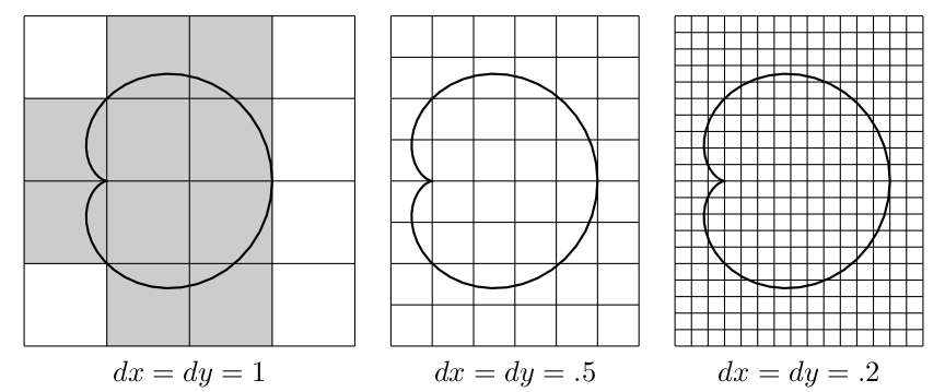 One way to compute the area of a region $R$ is overlay the region with a rectangular grid, where $dx$ and $dy$ are the distances between the vertical and horizontal lines of the grid. To find the area of the region, we first determine which of the rectangles contains a portion of the region $R$, and then add up the areas of of all such rectangles. This will overestimate the area, but we can then use limits to shrink both $dx$ and $dy$ to zero to obtain the area.