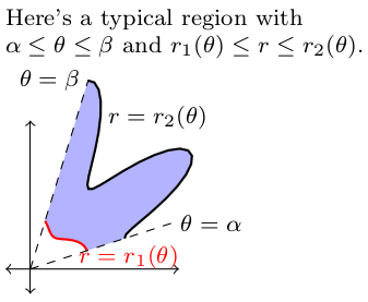(*Remember that x = r Cos[theta] and y = r Sin[theta] for polar coordinates*) ParametricPlot[{r Cos[\[Theta]], r Sin[\[Theta]]}, {\[Theta], 0, \[Pi]}, {r, 1, 3}] R = ParametricRegion[{r Cos[\[Theta]], r Sin[\[Theta]]}, {{\[Theta], 0, \[Pi]}, {r, 1, 3}}]; Region[R, Axes -> True, AxesLabel -> {x, y}, AxesOrigin -> {0, 0}] - Shade the region in the $xy$-plane that satisfies the polar coordinate inequalities $-\frac{\pi}{6}\leq \theta \leq \frac{\pi}{6}$ and $0\leq r\leq 4\cos 3\theta$.