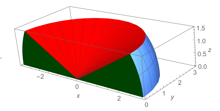 - Set up an integral to find the volume of the region in space above the $xy$-plane that is bounded above by the sphere $x^2+y^2+z^2=9$ and below by the cone $z^2=x^2+y^2$. Remember that the Jacobian for spherical coordinates is $|\rho^2\sin\phi|$.