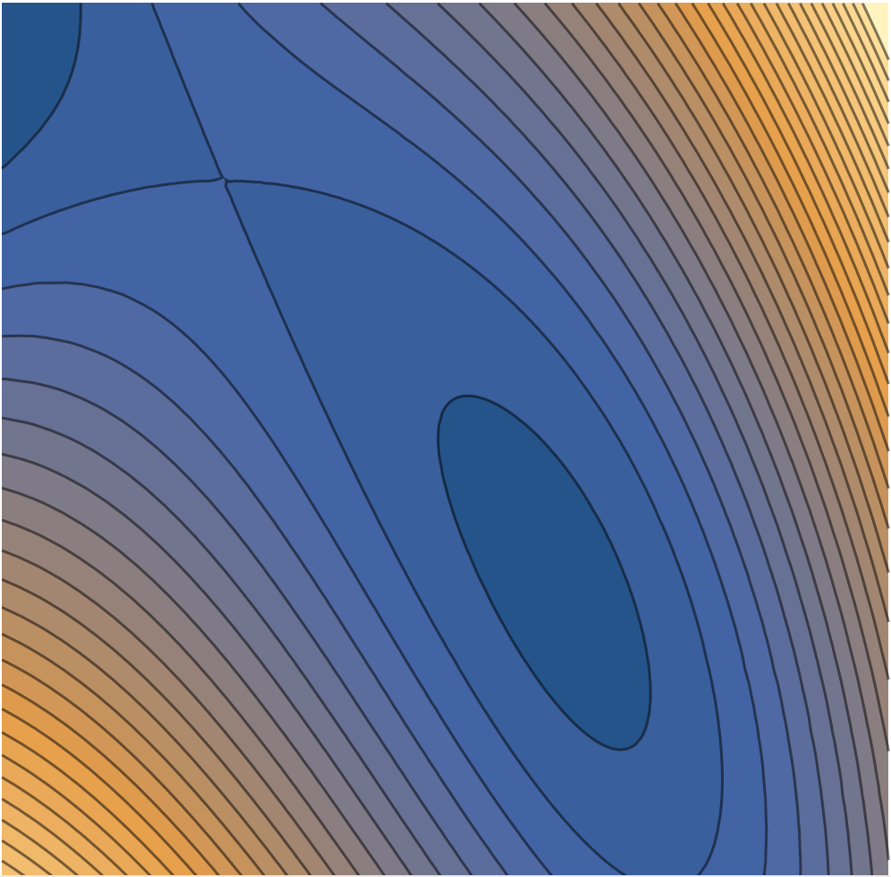 - The image below shows a contour plot of a function $f$. Use Zoom's annotate tool to add $\vec \nabla f$ to several points on the plot. Add at least two vectors, one where the gradient should be long, and another where the gradient should be short.