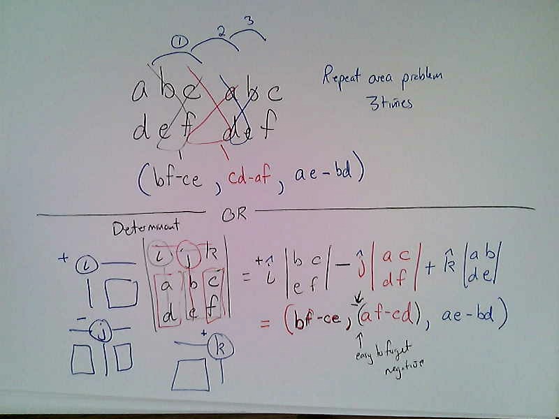 - Find a nonzero vector that is orthogonal to both $(a,b,c)$ and $(d,e,f)$.
