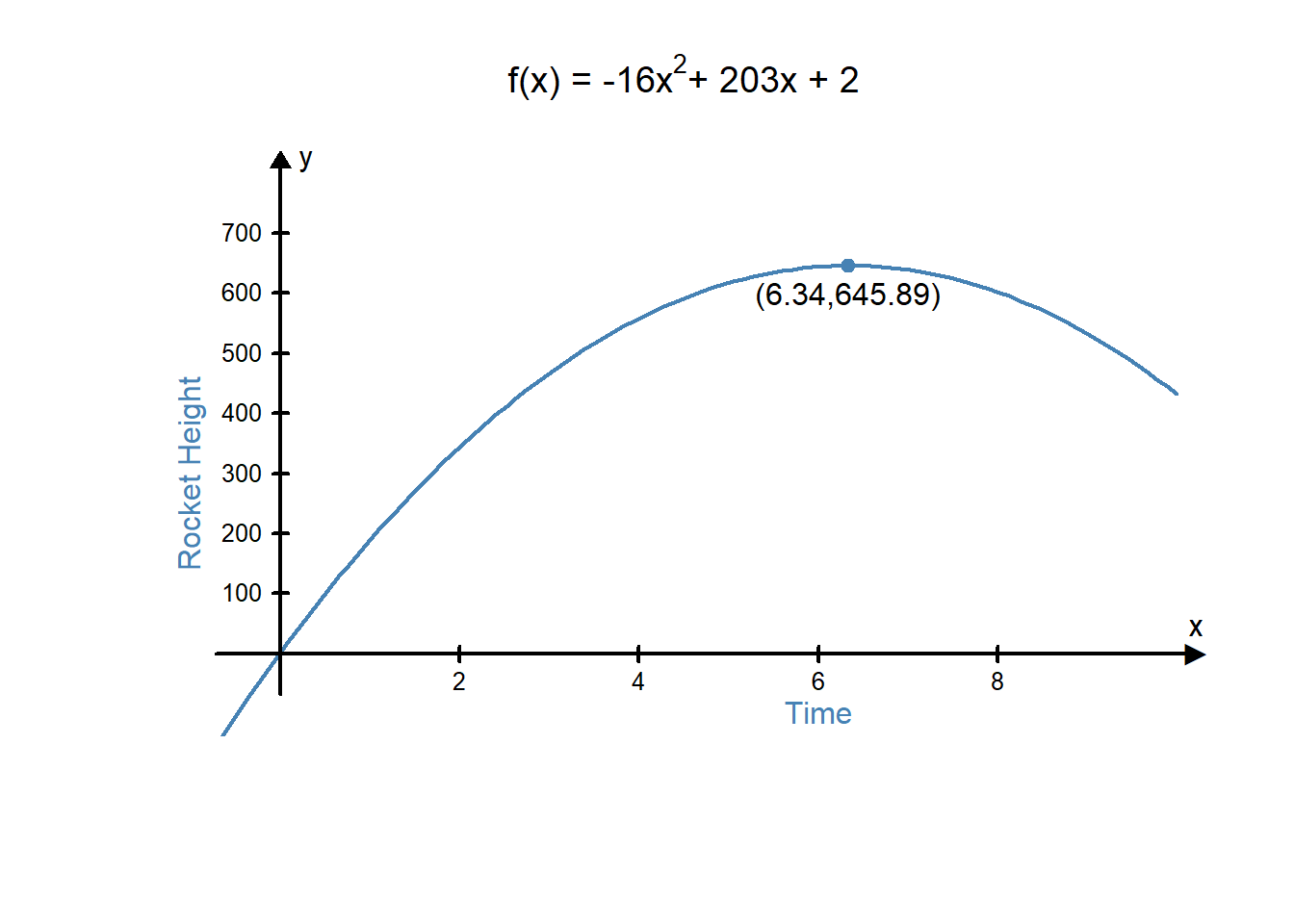 Because of the negative in the equation, he knows the parabola opens down, so the highest point will be at the vertex of the parabola. He finds the vertex of the parabola: \[x=\frac{-b}{2a}=\frac{-203}{2\cdot -16}=6.34\] \[f(6.34)=-16(6.34)^2+203(6.34)+2=645.89\] Since the vertex of the parabola is \((6.34, 645.89)\), Andre knows the rocket will be 645.89 feet above the ground 6.34 seconds after he fires the rocket. So, he needs to use a fuse that will burn for 6.34 seconds.