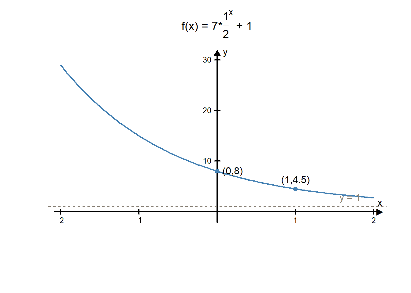 This is an exponential function of the form \(f(x)=a(b^x)+c\) where \(a=7\), \(b=1/2\), and \(c=1\).