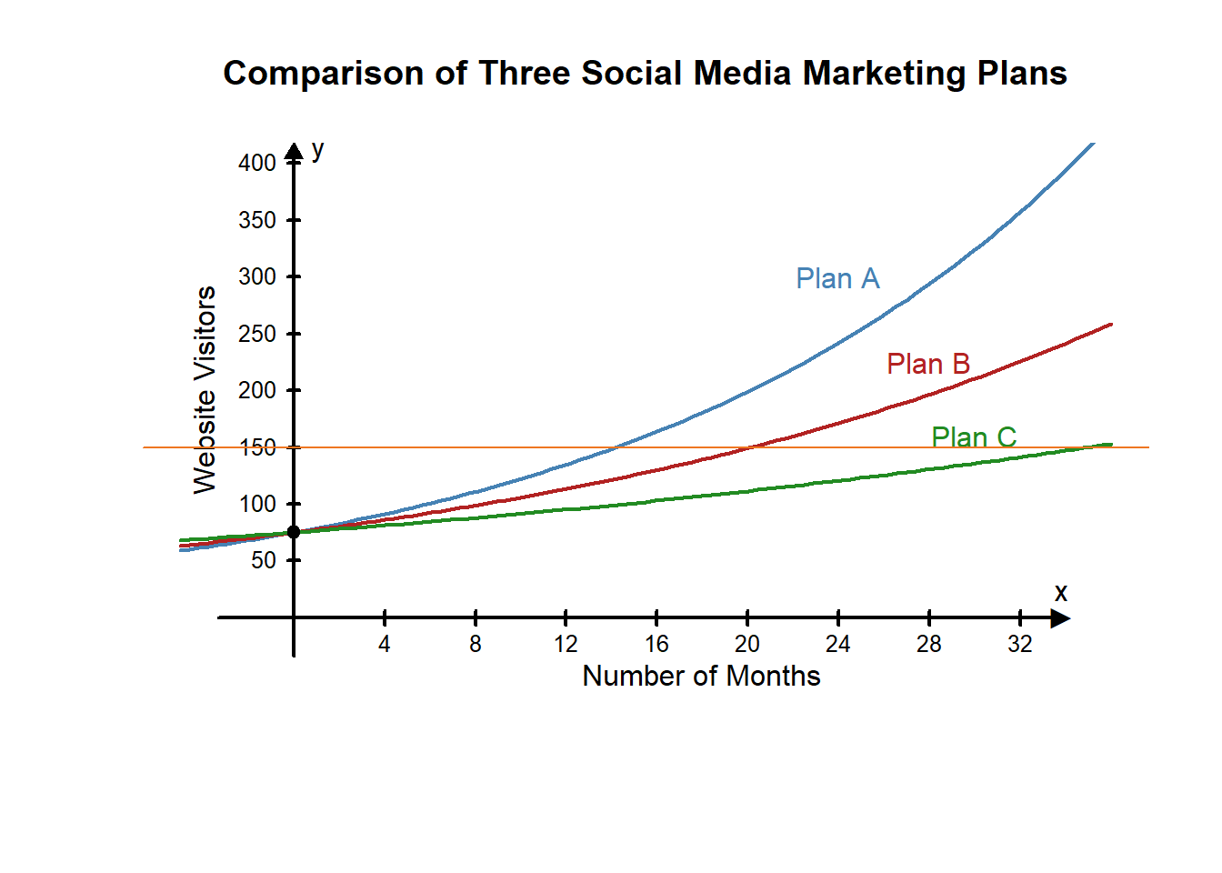 Because he is trying to get to 150 website visitors per month, he decides to draw a line on the graph at \(y=150\) so he can see how long it will take to reach 150 website visitors with each plan.