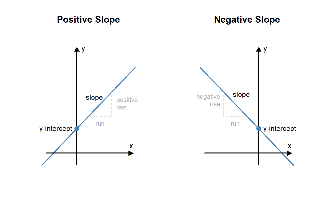 The slope of a line is a number that tells us how steep the line is. If the slope is \(\frac{2}{3}\), starting from any point on the line, we go up 2 units for every 3 units we go to the right. If the slope is \(-4\), we would start at any point on the line and then go down 4 units for each 1 unit we go to the right.