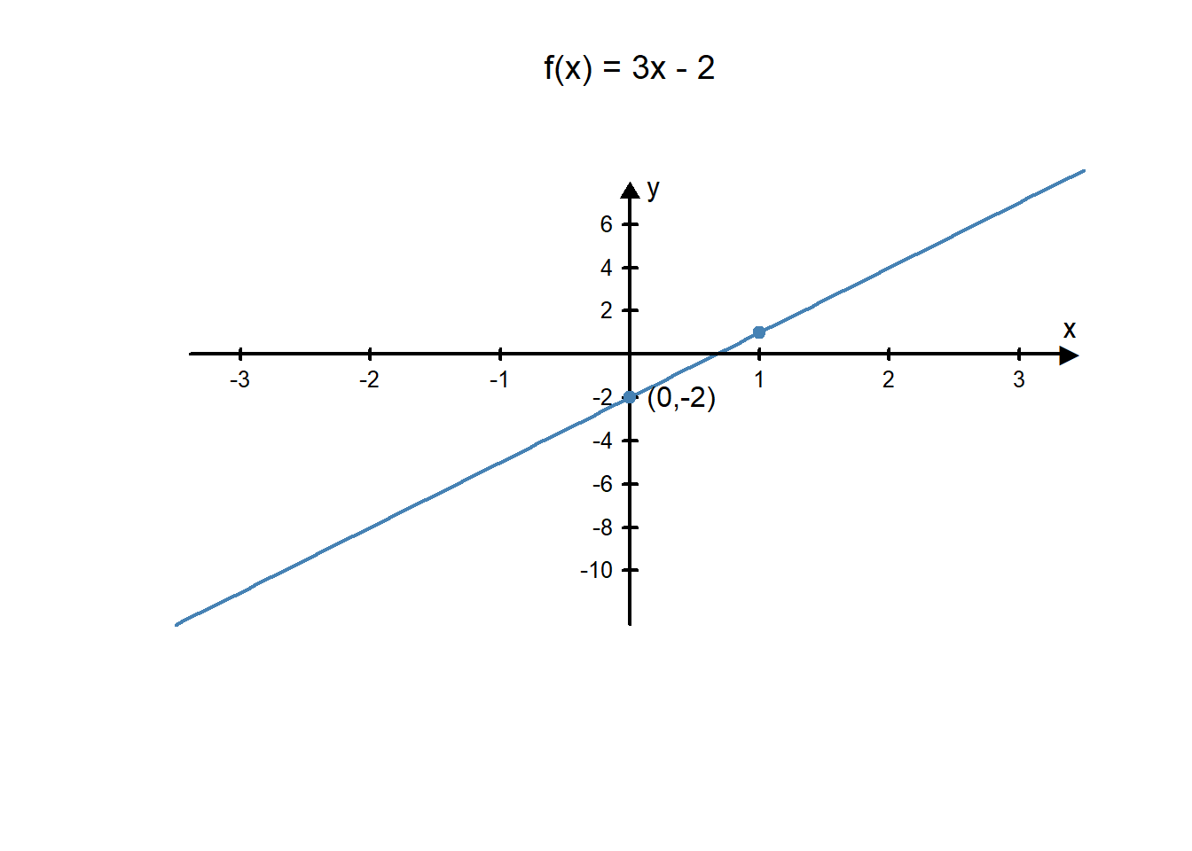 The function \(f(x)=3x-2\) is a linear function because its form matches the general form of a linear function: \(f(x)=mx+b\). In this example, \(m=3\) and \(b=-2\). We could graph this function by using the fact that it will cross the \(y\)-axis at the point \((0,-2)\) and has a slope of \(3\).