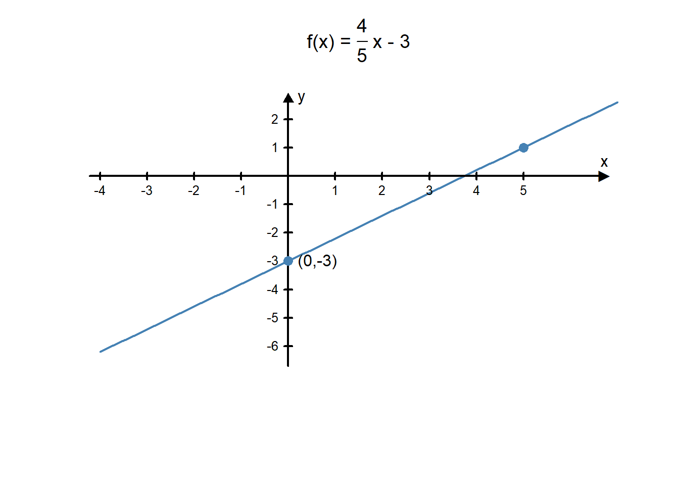 Solution The equation of this linear function is written in slope-intercept form, so we know the y-intercept is \((0,-3)\) and the slope is \(\frac{4}{5}\). We can use this information to help us graph the function: