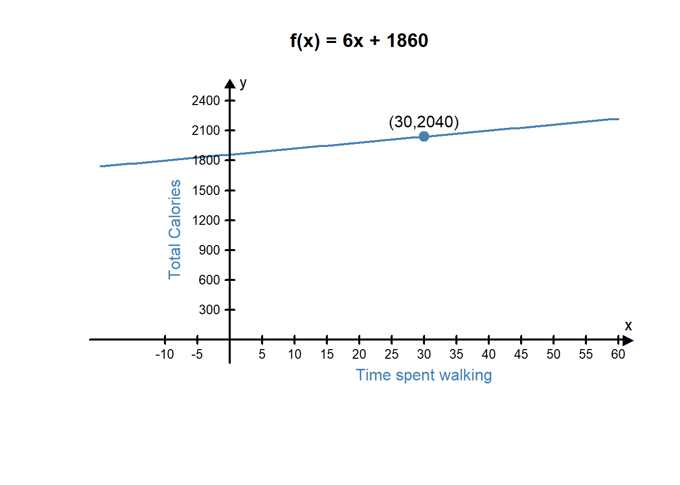 \[ f(x)=6 x+1860 \] Sarah makes the following chart to determine how many total calories she would need each day, depending on how long her walk is: